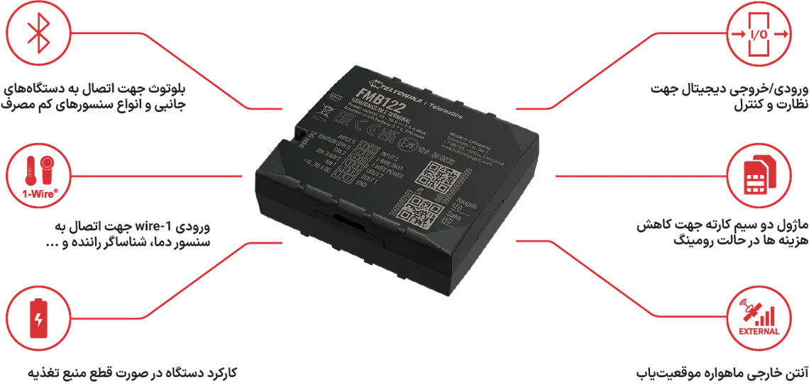 | تنظیم دستگاه و به روزرسانی فریمور | از طریق نرم افزار تحت وب FOTA، نرم افزار تنظیم و راه اندازی تلتونیکا (USB)، برنامه اندروید FMBT (فقط جهت اعمال تنظیمات) |