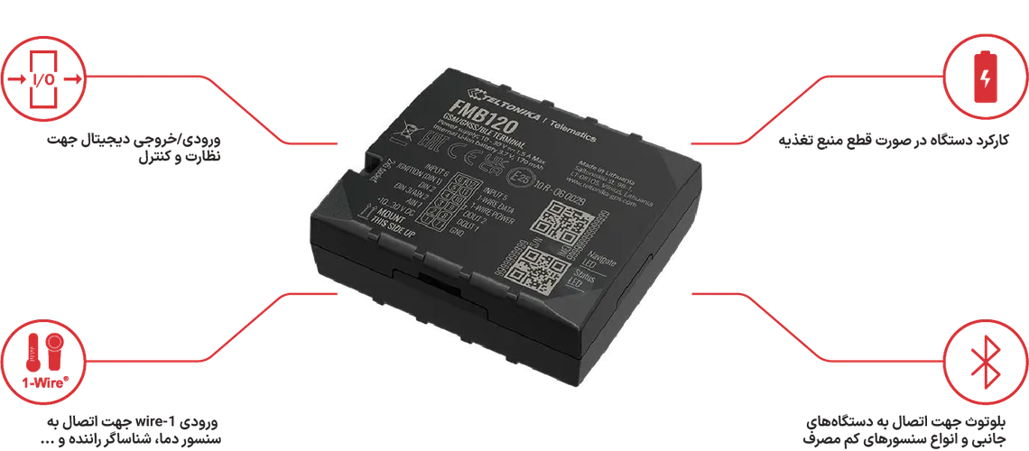 | تنظیم دستگاه و به روزرسانی فریمور | از طریق نرم افزار تحت وب FOTA، نرم افزار تنظیم و راه اندازی تلتونیکا (USB)، برنامه اندروید FMBT (فقط جهت اعمال تنظیمات) |